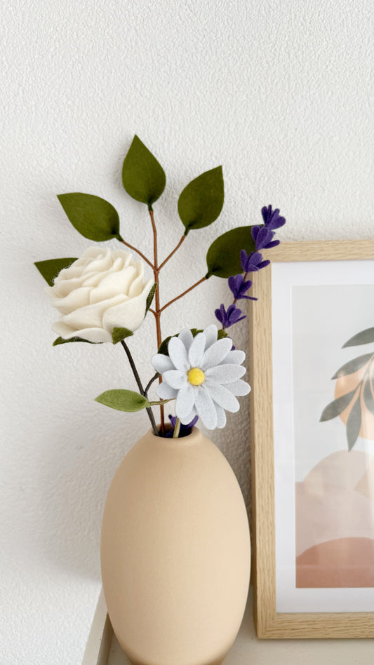 Welkom in de bloemenwinkel van Felttique! Met onze vooraf samengestelde viltboeketten haal jij een prachtige duurzame bos viltbloemen in huis. Onze boeketten zijn ook zeer geschikt als cadeau: of het nu gaat om een felicitatie, een condoleance, een nieuwe collega of een geboorte, voor elke gelegenheid vind je in onze collectie een geschikt viltboeket. Maak je cadeau helemaal af door een mooie bijpassende vaas te kopen en vergeet ook het kaartje niet voor een persoonlijke boodschap.