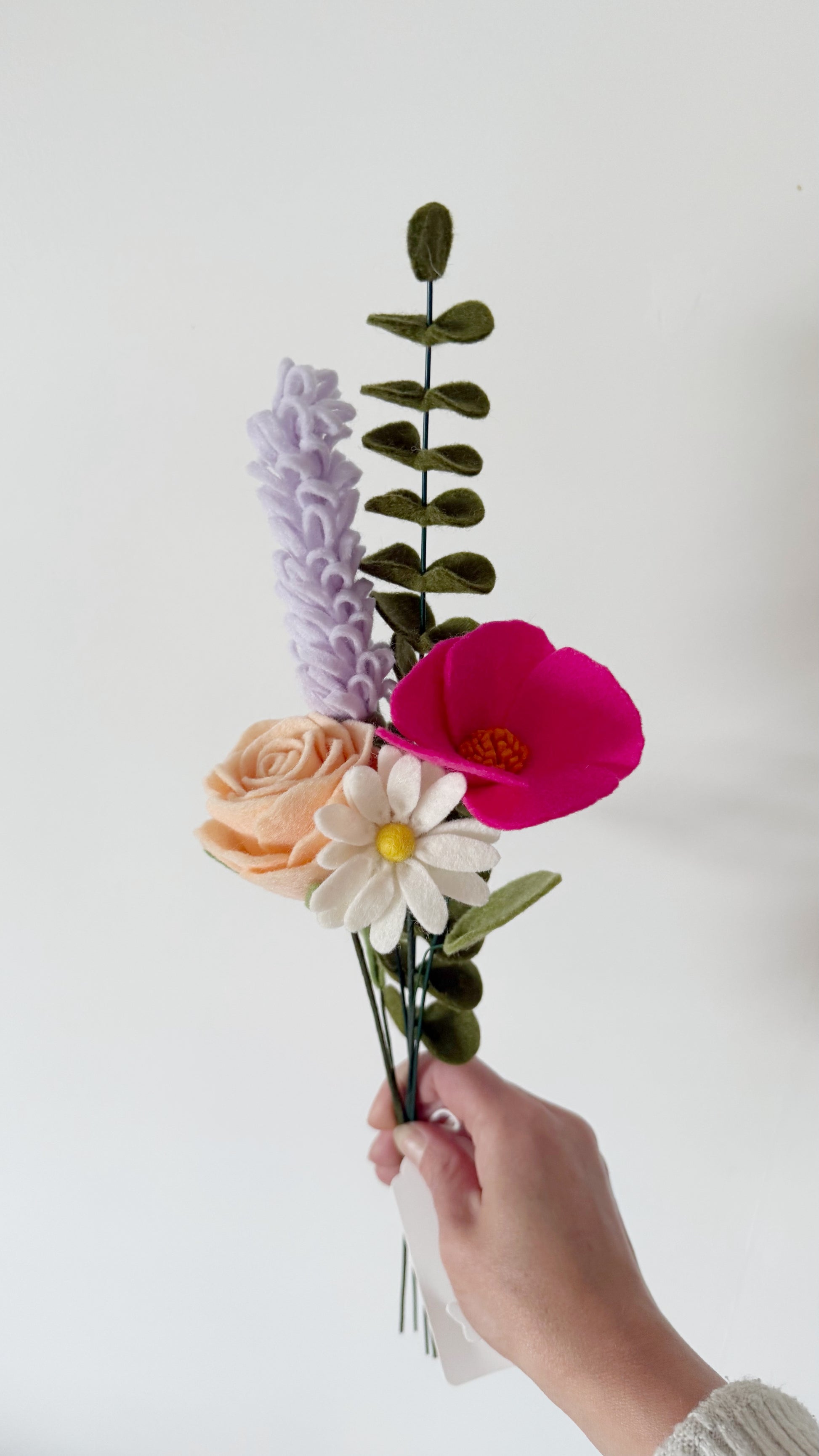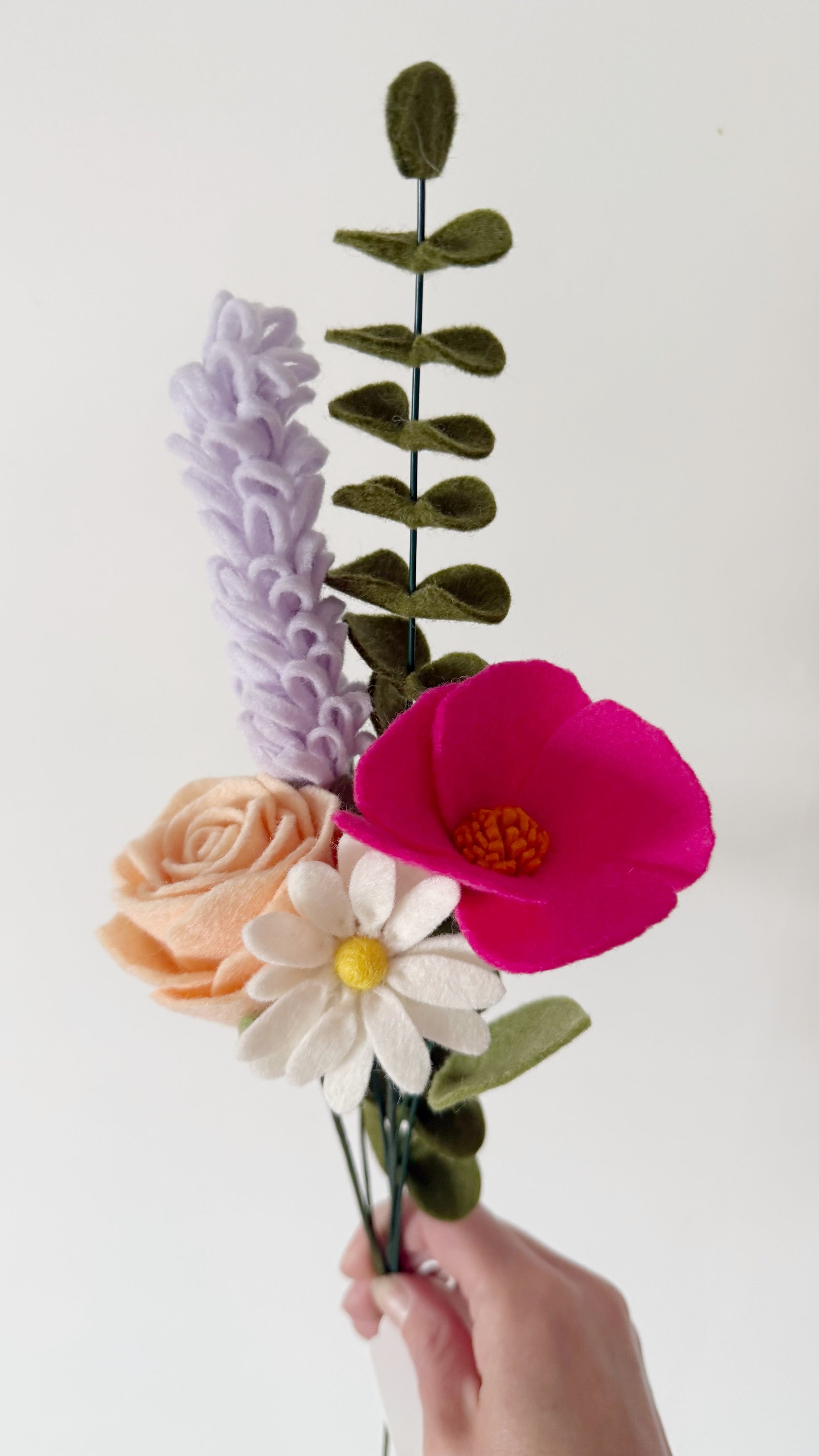 Dit vrolijke viltboeket in roze & paarstinten haalt meteen het voorjaar in huis! In het boeketje zitten dd volgende viltbloemen: een margriet, een roos, een cosmea, een lavendeltak en een eucalyptustak.