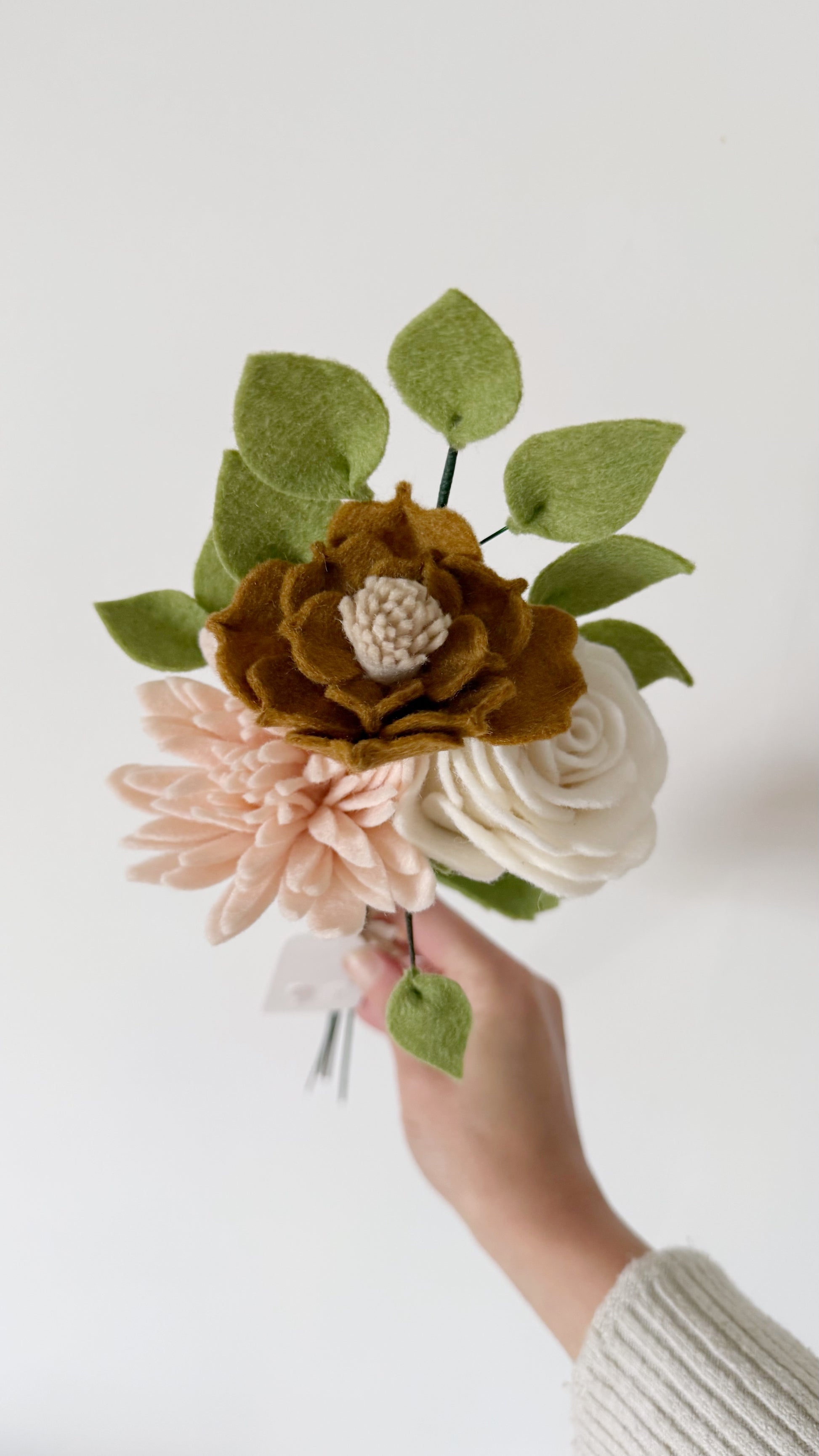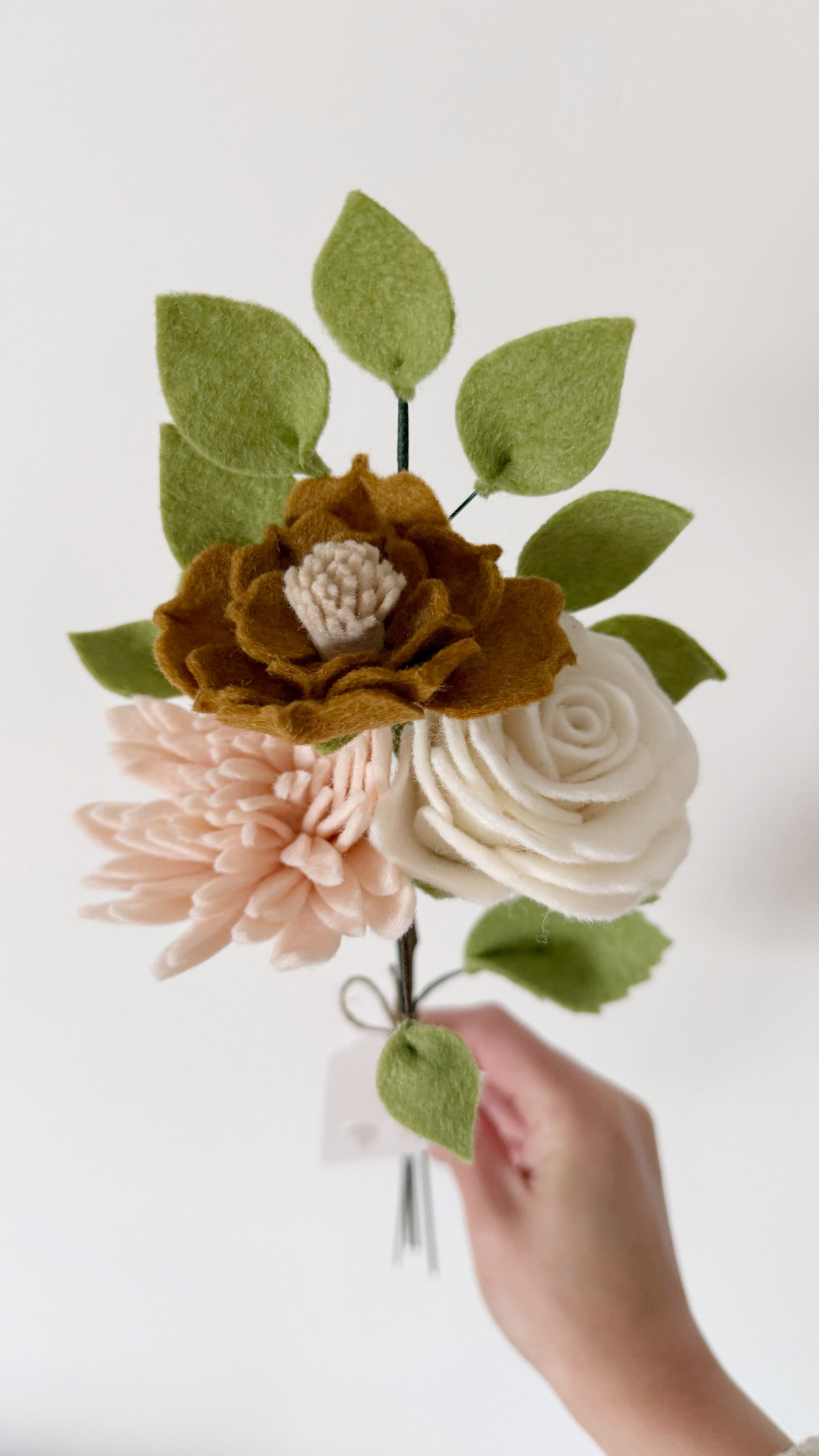 Dit prachtige boeket in zachte tinten is een perfecte toevoeging aan je interieur. Het viltboeket bestaat uit een roos, een chrysant, een kleine magnolia en een eucalytustak.