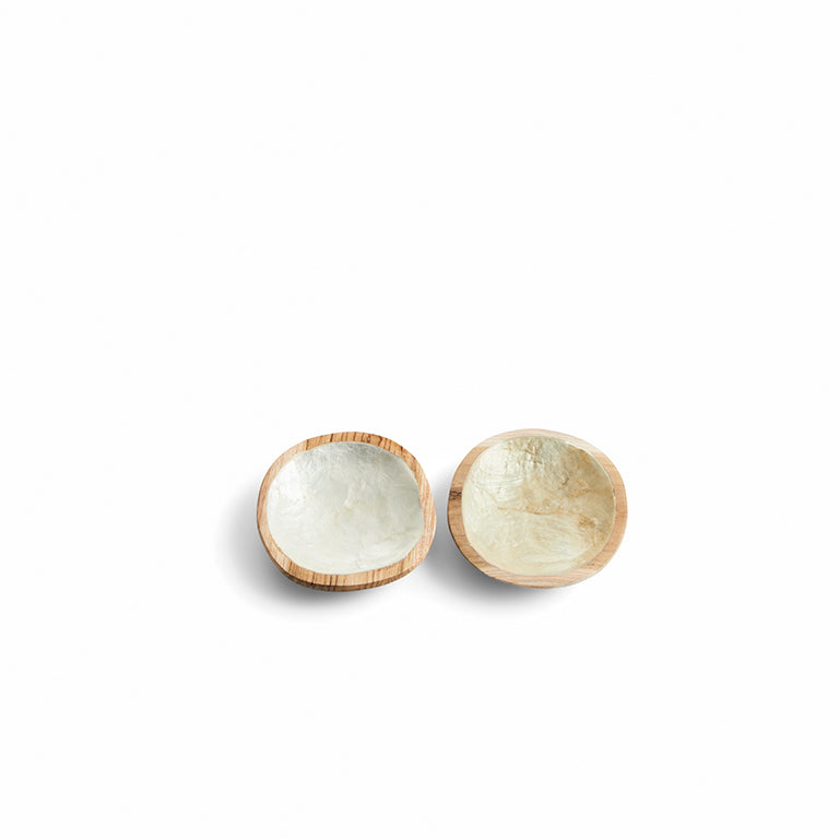 Houten schaaltje met binnenzijde van capiz schelp om je geurblokje op te leggen. De schaaltjes worden met de hand gemaakt waardoor ze kunnen variëren van vorm. Diameter 8cm.
