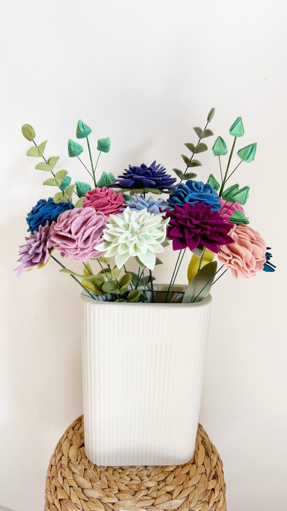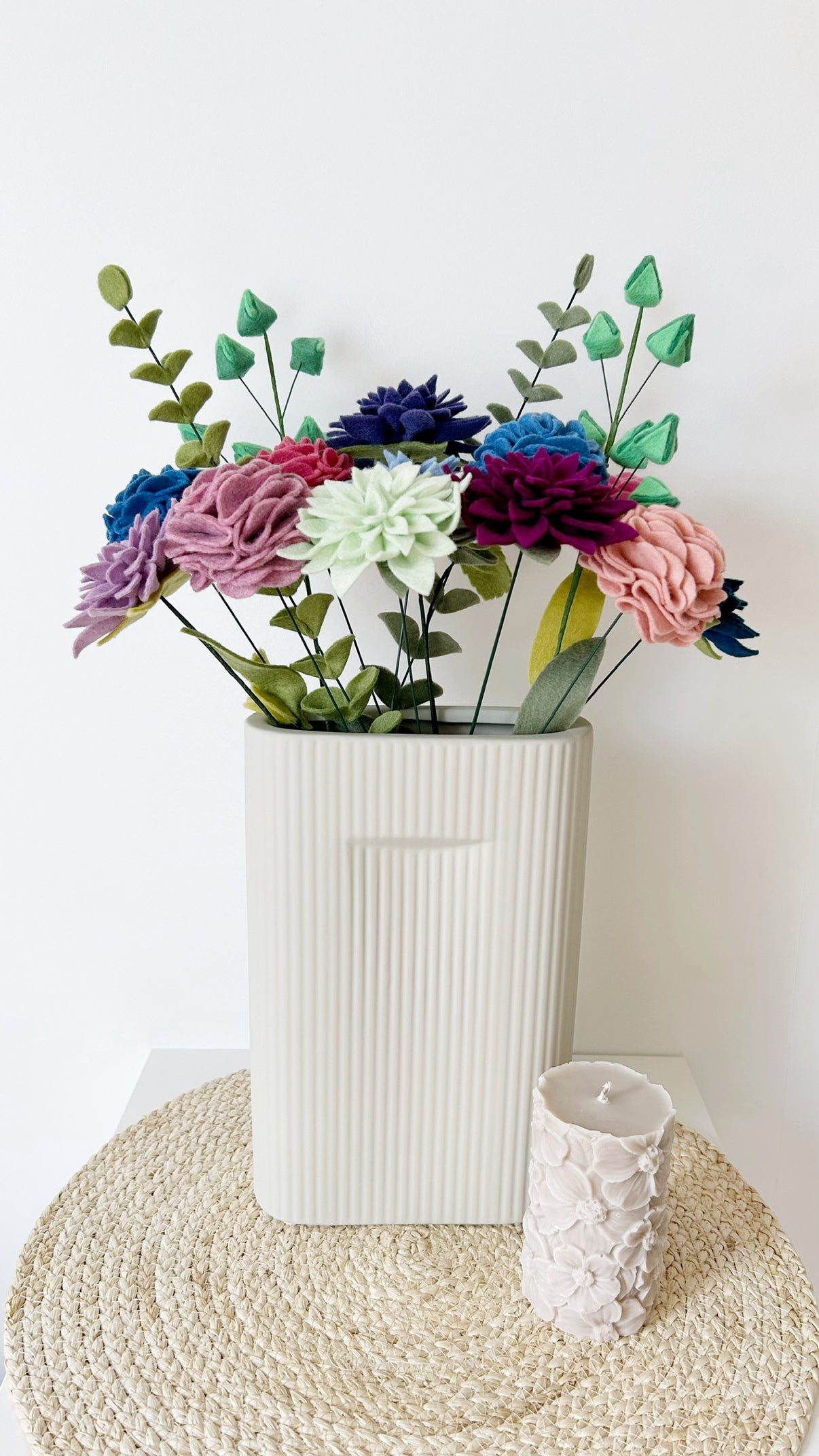 Deze prachtige moderne vaas met reliëf is een echte eyecatcher! De vaas matcht door zijn eenvoud in elk interieur en is niet alleen mooi met een hele bos viltbloemen maar zéker ook met enkele losse takjes zoals Eucalyptus.