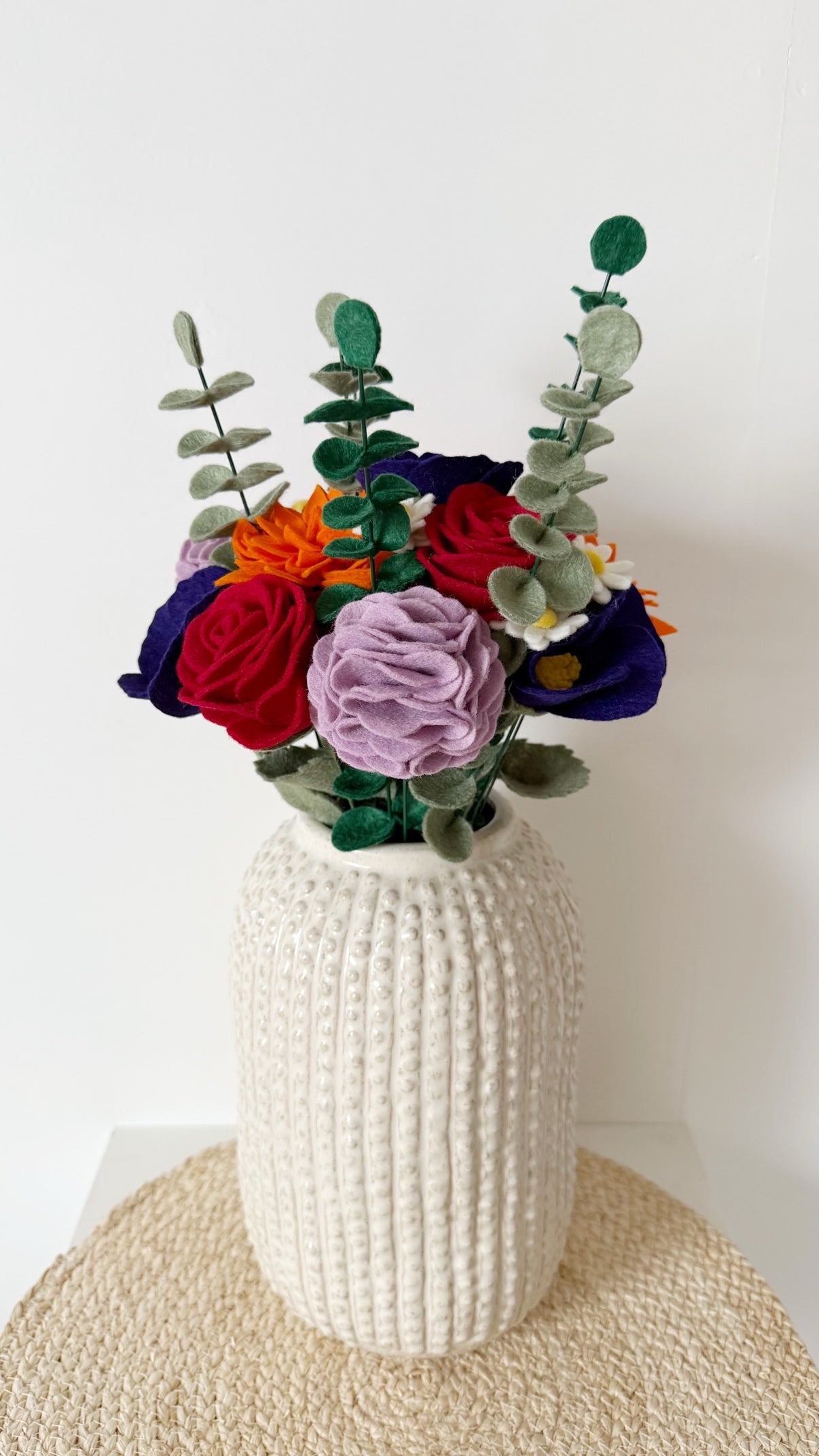 Deze prachtige chique vaas met reliëf en glanslaagje matcht perfect met al onze boeketten van viltbloemen. De stenen vaas heeft een moderne doch speelse look en past hierdoor ook goed in een landelijk interieur. Ook leuk zonder bloemen, als decoratie.